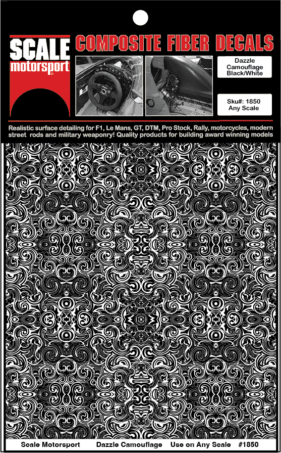 Dazzle Camouflage #1850 is our fabulous dazzle pattern printed as black over a solid white background. Simply paint the surface of you build as you would with any color for an undersurface and using Scale Motorsport's Decal-Magic BLACK Setting solution and your Dazzle Camouflage #1850 displaye that perfect camouflage body