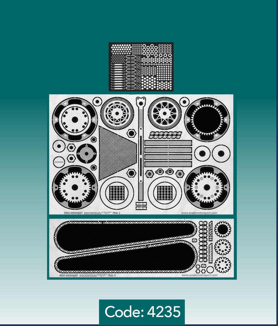 Front Disc Details - Rear Disc Details - Large Nuts - Large Sprocket - Large Nut Details - Fairing Mesh - Rear Disc Vent - Exhaust Clamp - Dzus Fasteners - Large Sprocket Details - Front Disc Details- Back - Clutch Plate - Rear Disc - Wheel Weights - Chain - Handlebar Logo - Valve Cover Logo - Small Sprocket - Small Sprocket Details Kawasaki Ninja ZX-RR Scale Motorsport #: 4240 Mates with Scale Motorsport #: 7240 Designed for Tamiya #: 14109 Materials: Nickel Silver (or Stainless Steel) - Outer Rear Chain Sprocket - Front Brake Disc - Right Side Engine Detail - Radiator Face - Cowl Fasteners - Clutch Details - Left Side Engine Details - Right Side Chain Adjuster - Rear Chain Sprocket - Front Rotor Support - Hose Clamp - Front Rotor Details - Display Panel Knob - Display Panel Lights
