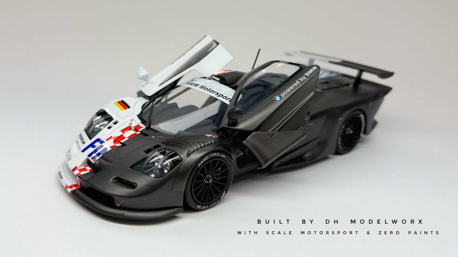 A four sheet carbon fiber template set designed to fully dress the exterior of your Aoshima McLaren F1 GTR. This set includes four sheets of our 1024 carbon fiber decals with the template patterns printed on the reverse side of the decal sheet. Included in the package is a complete instructional set clearly illustrating each templates placement. Aoshima hit the ball out of the park with this kit, now make your build extra special with Scale Motorsport's Full Carbon Jacket!
